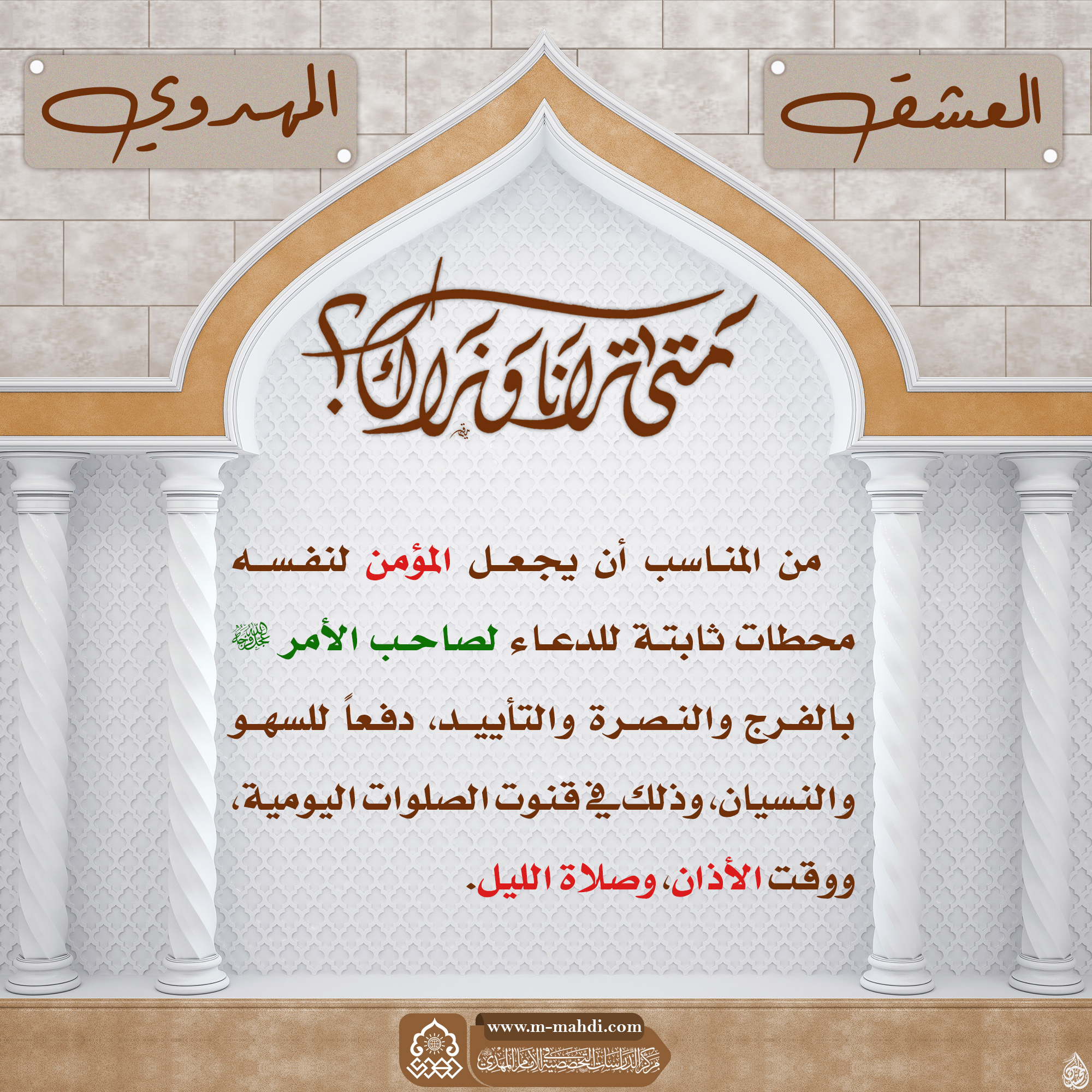 بسم الله الرحمن الرحيم اللهم كن لوليك الحجة بن الحسن صلواتك عليه وعلى آبائه في هذه الساعة وفي كل ساعة وليا وحافظا وقائدا وناصرا ودليلا وعينا حتى تسكنه ارضك طوعا وتمتعه فيها طويلا