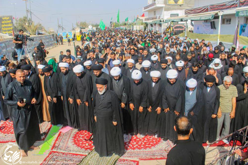 حتى إذا كان يوم السابع عشر من صفر الخير، تآلفوا في صلاة جماعة ممتدة هي الأعظم من حيث العدد والكيف، وعلى طول خط الزيارة، وللعام الخامس على التوالي، تُقام صلاة الجماعة بوقت واحد، حيث يصطف عشرات الآلاف من المصلين خلف أئمة جماعة يزيد عددهم على ٧٥٠ إماماً (لهذا العام)، وعلى مسافة تمتد إلى حوالي الأربعين كيلو متراً على طريق (يا حسين) بين النجف وكربلاء، ليُجسدوا موقف الإمام الحسين (عليه السلام) يوم عاشوراء، يوم لم يأبه بالسيوف والرماح، ليتوجه بكيانه إلى رب العالمين.