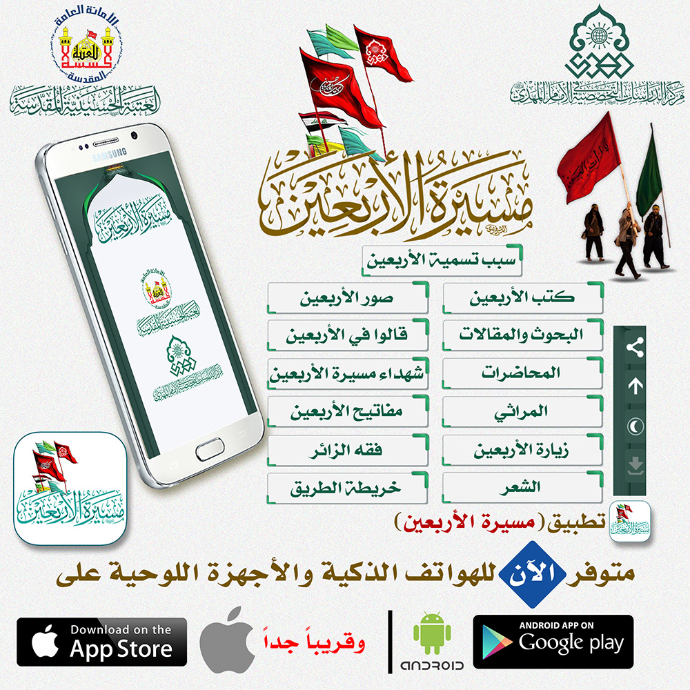 ومركز الدراسات التخصصية في الإمام المهدي (عجّل الله فرجه) الذي دأبَ على أن يقدّم للمؤمنين البرامج الحيوية والفاعلة يقدِّم اليوم هذا التطبيق عن هذه المسيرة المباركة والذي يتضمّن في إطار محتوياته حديثاً عن سبب التسمية لهذه المسيرة بـ(الأربعين)، وحقل آخر ينقل ما كُتب عنها من كتب وبحوث ومقالات، لينقل القارئ الشغوف والمتابع الحثيث إلى حقل المحاضرات ليقطف منها أقوالاً ولائية تحفّز في روحه وتجذِّر في أعماق وجدانه ولاءً حيوياً ينبض به قلبه، لينقله بعد ذلك هذا التطبيق المبارك بما يحويه إلى المراثي والزيارات، فيحطّ رحاله في محطة الشعر ليلتمس من وجدانياتها أنغاماً تصعد لقلبه إلى عالَمٍ فضاؤه عشق أهل البيت (عليهم السلام)، ليرى وهو في ذلك العالَم صور الماضي التي حَكَت تلك المأساة بصور الحاضر التي يجسِّدها الموالون، وهو في هذه النشوة العشقية يستمع إلى ما يقوله العظماء في هذه المسيرة الخالدة لينظر بعين البصيرة من خلال خارطة الطريق ليحدد المسافة بينه وبين المعشوق بنظرة إلى شهداء مسيرة الأربعين تدفع بظهره وتقوّي عزمه الاستفتاءات الشرعية وفقه الزائر لتنفتح أمامه من خلال حقل مفتاح الأربعين أبواب جنان الخُلد التي لا عين رأت ولا أذن سمعت من قبل، إنها مسيرة الأربعين من خلال هذا التطبيق.