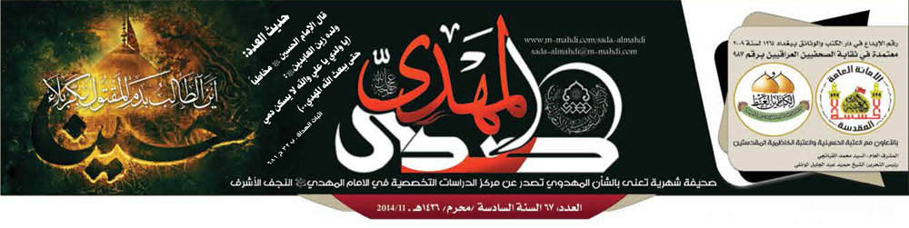 تم صدور صحيفة صدى المهدي عليه السلام العدد ٦٧ السنة السادسة/ محرم الحرام/ ١٤٣٦هـ - ١١/ ٢٠١٤م