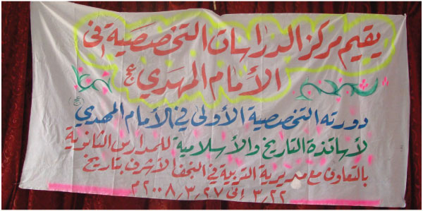 من أجل النهوض بالثقافة المهدوية الأصيلة وتأصيل عقيدة الانتظار في صفوف الكادر التدريسي باعتباره يمثل أهم حلقة في المجتمع العراقي من حيث تحمله مسئولية التربية والتعليم لأبناء هذا الجيل من الكوادر الطلابية وهي أوسع شريحة في المجتمع، لذا قام مركز الدراسات التخصصية في الإمام المهدي عليه السلام وبتنسيق تام مع المديرية العامة للتربية في النجف الاشرف وعلى رأسها الاستاذ الوجيه اسماعيل خليل ماضي المحترم بعقد دورات تخصصية مكثفة في المعرفة المهدوية ولمدة اسبوع واحد لكل دورة، تتمثل في اثني عشر حصة درسية، يحاضر فيها اساتذة فضلاء من الحوزة العلمية وذلك في قسم الاعداد والتدريب في النجف الأشرف بإدارة الأستاذ الوجيه السيد باقر عبد محمد المحترم كما ان المشرف على الدورة من الناحية التنظيمة الإستاذ السيد علي شبر المحترم.