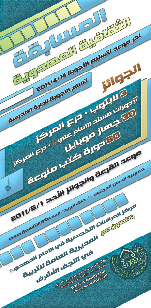 وسوف يكون موعد اجراء القرعة وتسليم الجوائز للمتسابقين الكرام بتاريخ ٢٠١١/٥/١ ميلادي وذلك في قاعة حسينية الحسن المجتبى عليه السلام خلف البريد الساعة التاسعة صباحاً.