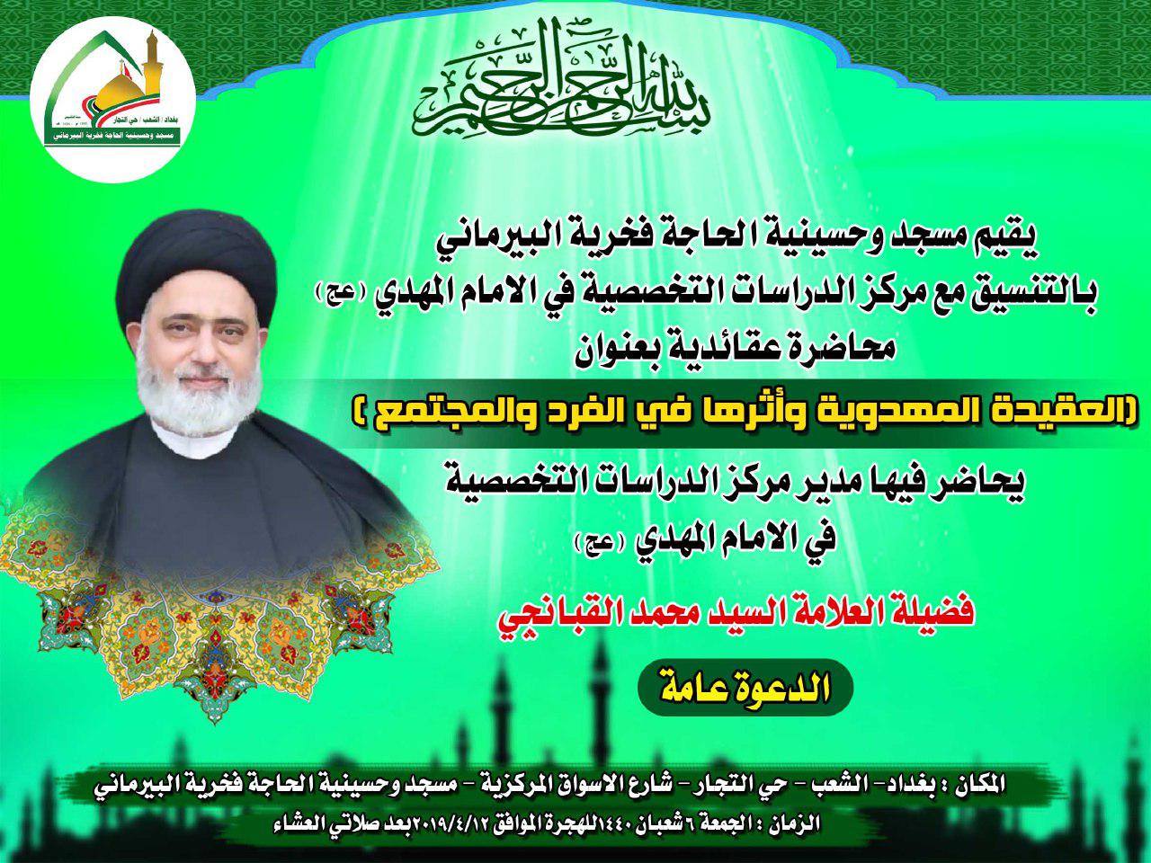 وذلك يوم الجمعة ٦ شعبان لسنة ١٤٤٠ المصادف ١٢/٤/٢٠١٩ مساءاً/ بغداد- الشعب- حي التجار- شارع الأسواق المركزية