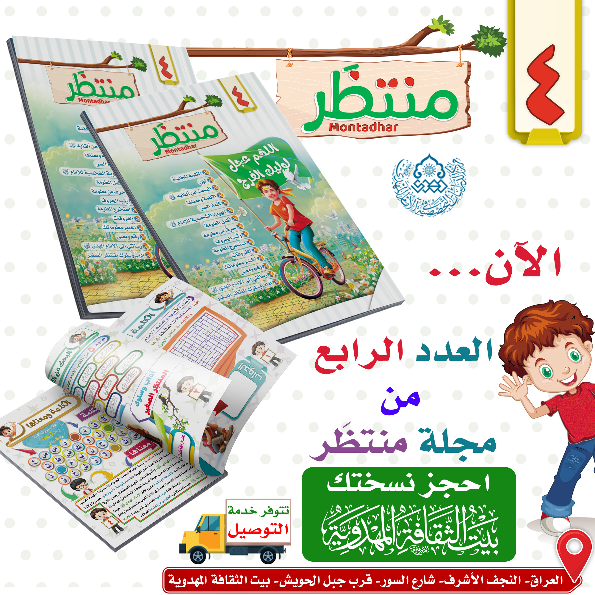صدر حديثاً العدد الرابع من (مجلة منتظَر) الخاصة بالطفل المهدوي، والتي تحتوي على العديد من المعلومات المهدوية التي تجعل من الطفل المنتظِر لإمامه (عجّل الله فرجه الشريف) منتظراً واعياً ومثقفاً، وتزيد من معلوماته المهدوية بطرق وأساليب وتسالي مبسطة وسهلة بحيث يفهمها الأطفال، تحتوي المجلة على ١٦ صفحة ملونة بأربعة ألوان.