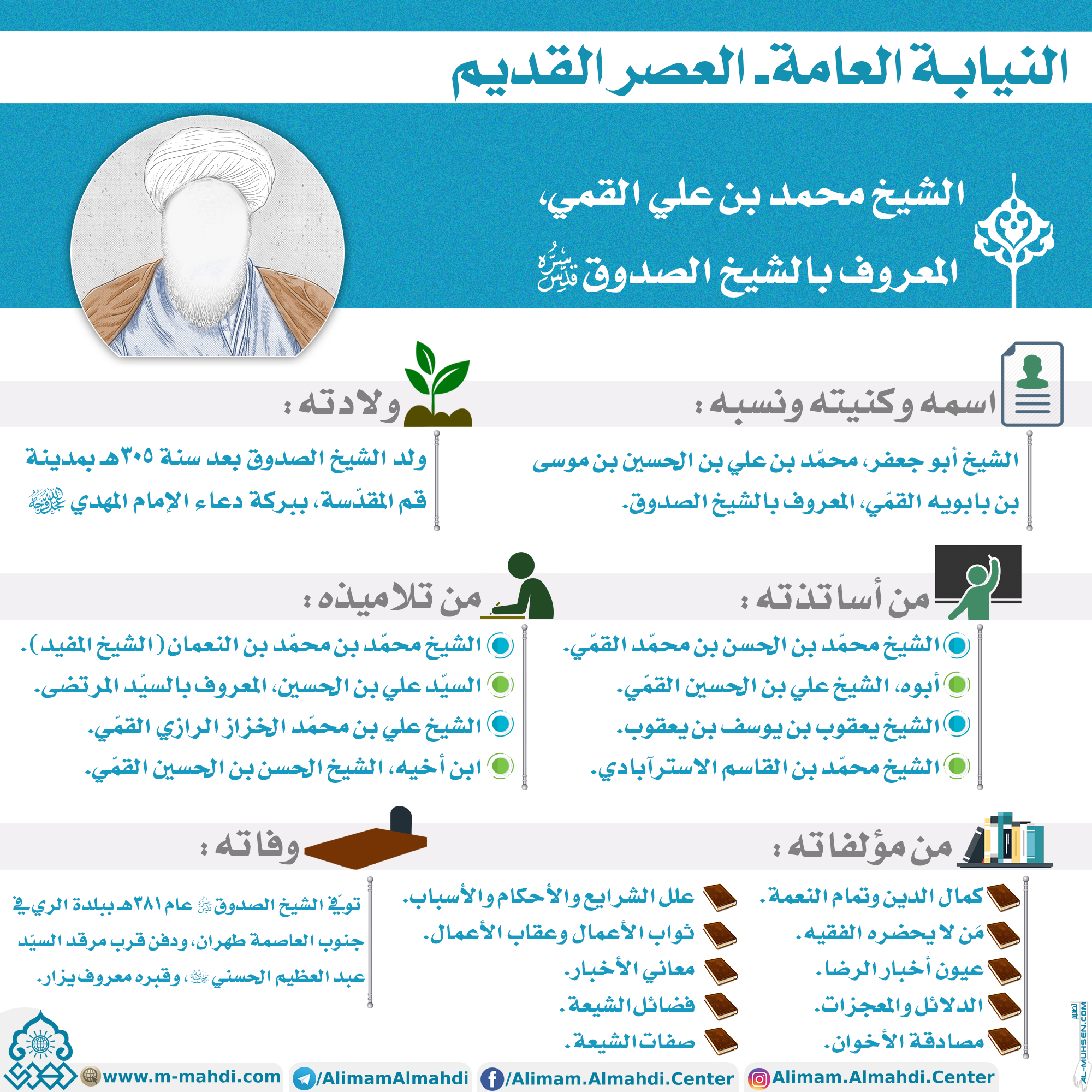 ولد الشيخ الصدوق بعد سنة ٣٠٥هـ بمدينة قم المقدّسة، ببركة دعاء الإمام المهدي (عجّل الله فرجه).
