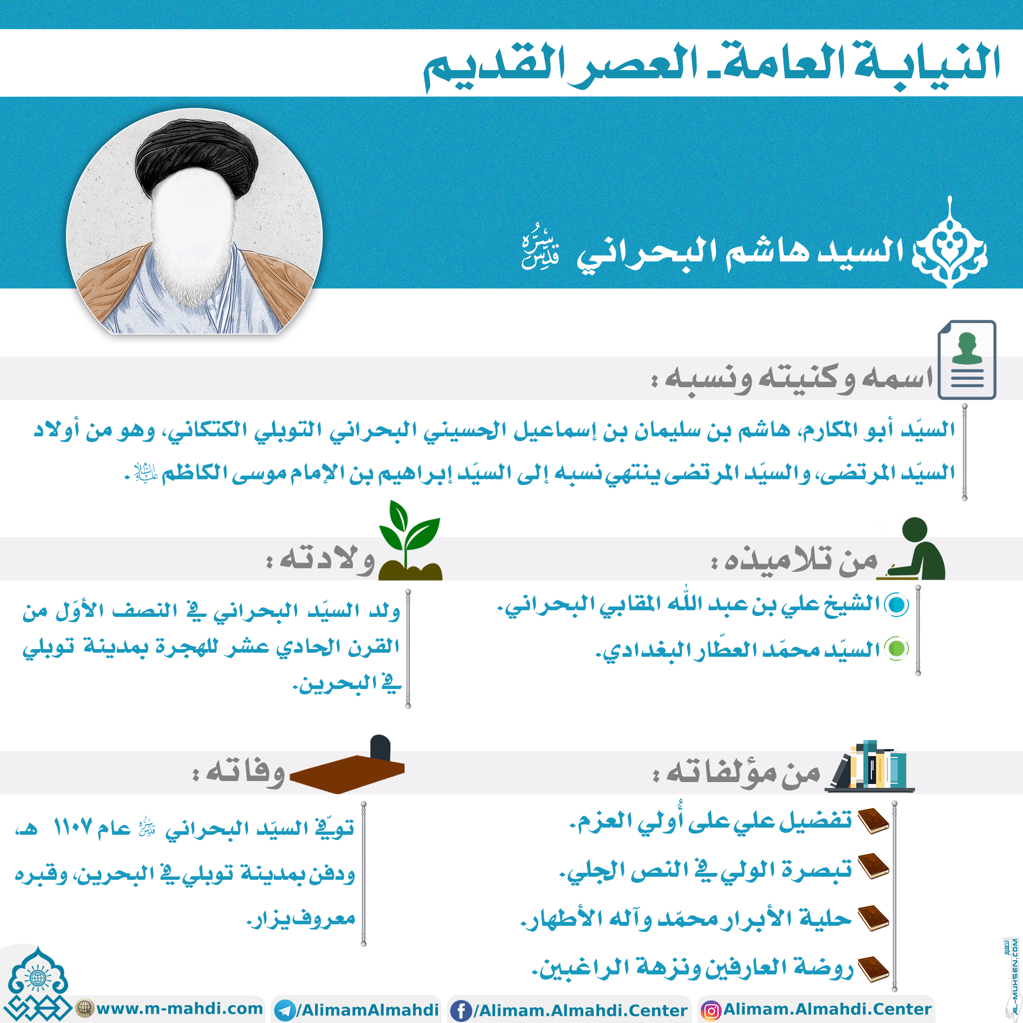 السيّد أبو المكارم، هاشم بن سليمان بن إسماعيل الحسيني البحراني التوبلي الكتكاني، وهو من أولاد السيّد المرتضى، والسيّد المرتضى ينتهي نسبه إلى السيّد إبراهيم بن الإمام موسى الكاظم (عليه السلام).