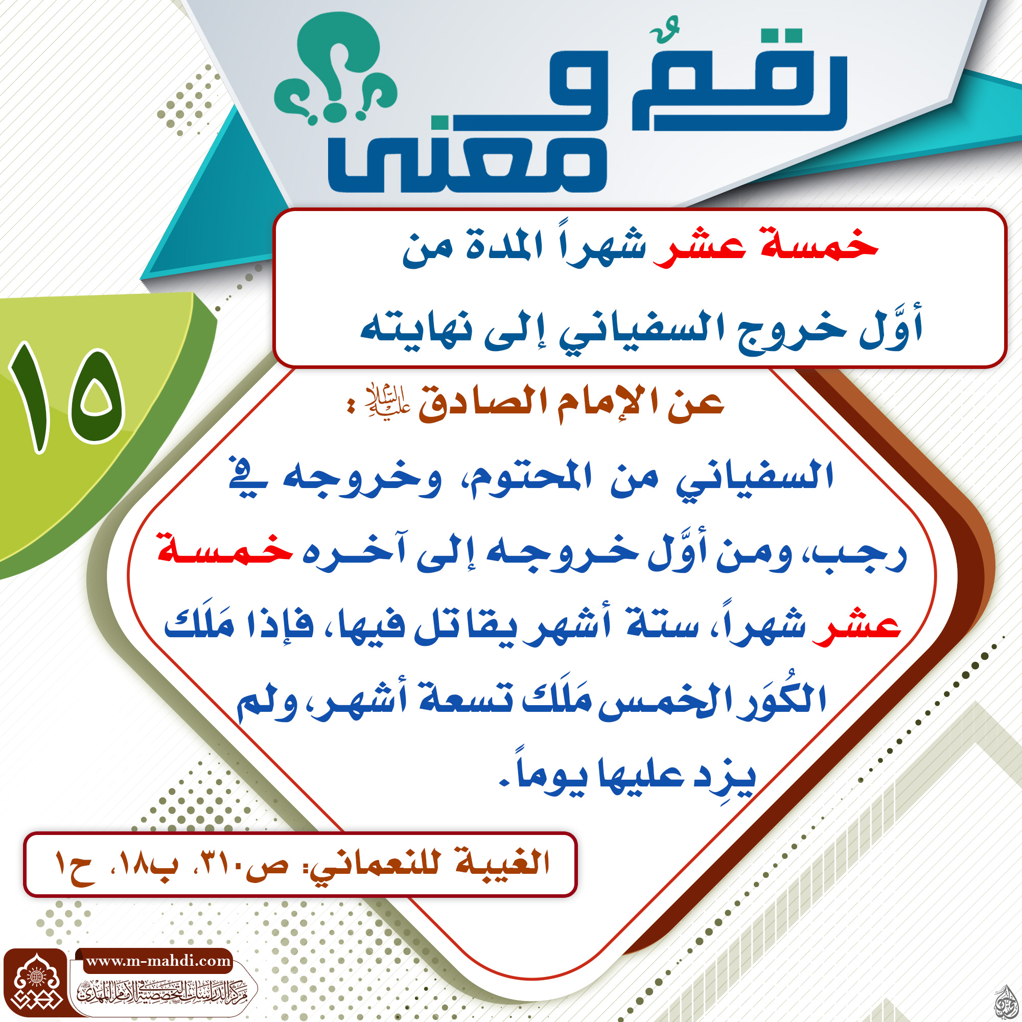 ? خمسة عشر شهراً المدة من أوَّل خروج السفياني إلى نهايته.
