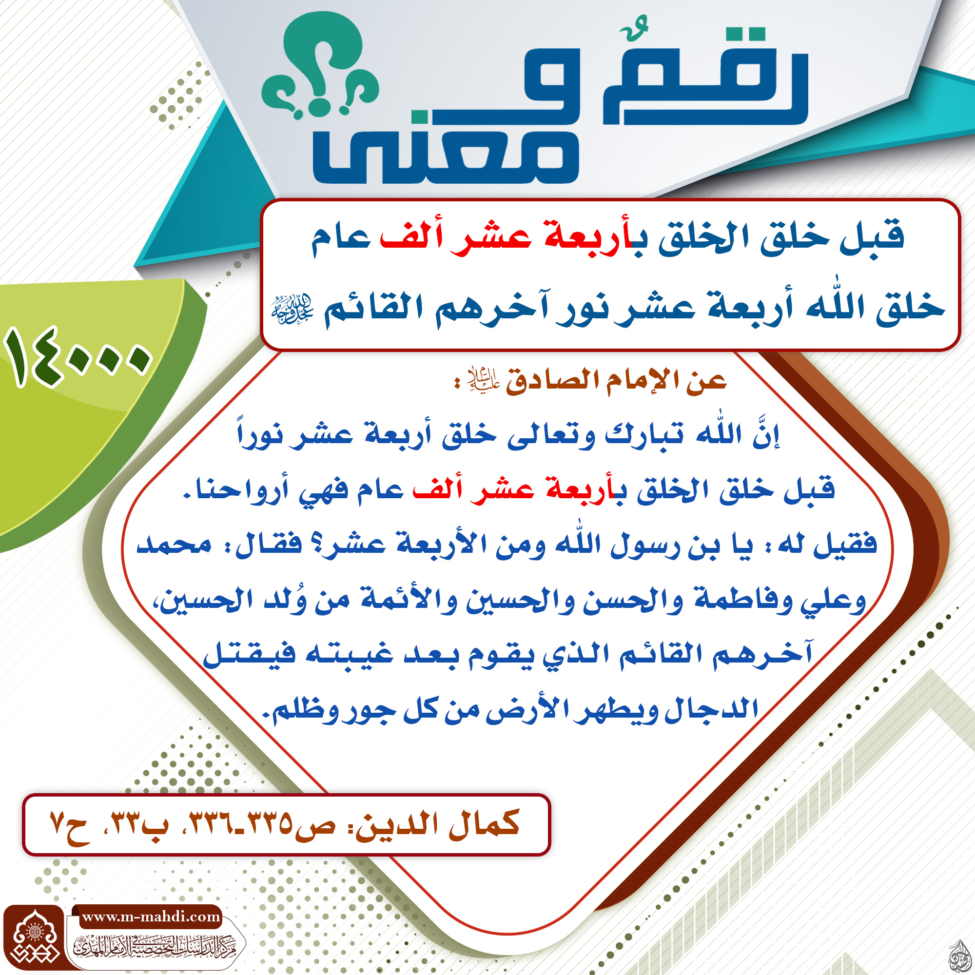 إنَّ الله تبارك وتعالى خلق أربعة عشر نوراً قبل خلق الخلق بأربعة عشر ألف عام فهي أرواحنا. فقيل له: يا بن رسول الله ومن الأربعة عشر؟ فقـال: محمد وعلي وفاطمة والحسن والحسين والأئمة من وُلد الحسين، آخـرهـم القائـم الـذي يقـوم بـعـد غيـبتـه فيـقـتـل الدجال ويطهر الأرض من كل جور وظلم.