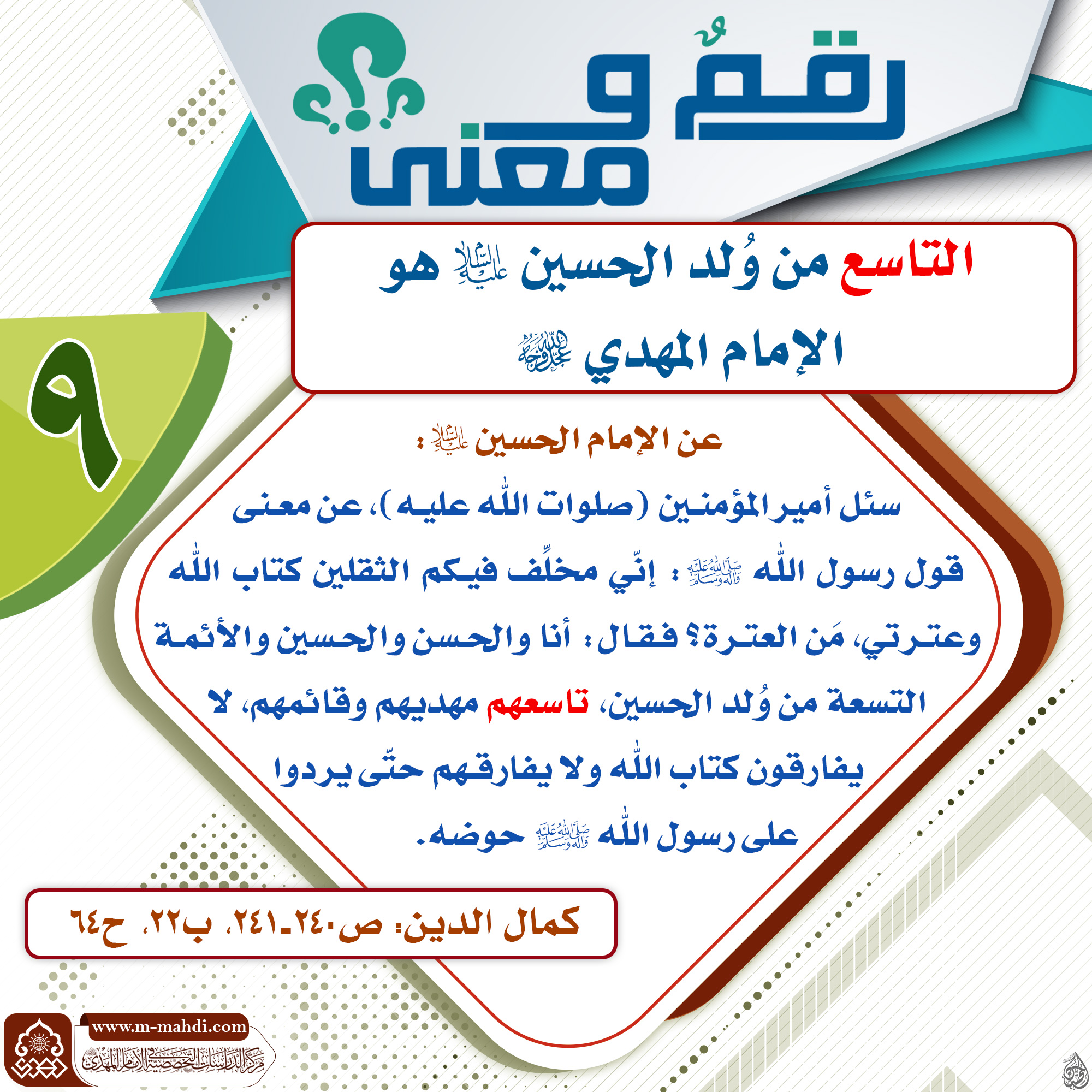 ? التاسع من وُلد الحسين (عليه السلام) هو الإمام المهدي (عجّل الله فرجه).
