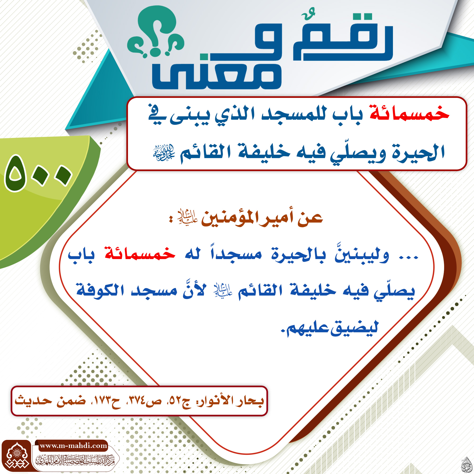 ? خمسمائة باب للمسجد الذي يبنى في الحيرة ويصلّي فيه خليفة القائم (عجّل الله فرجه).