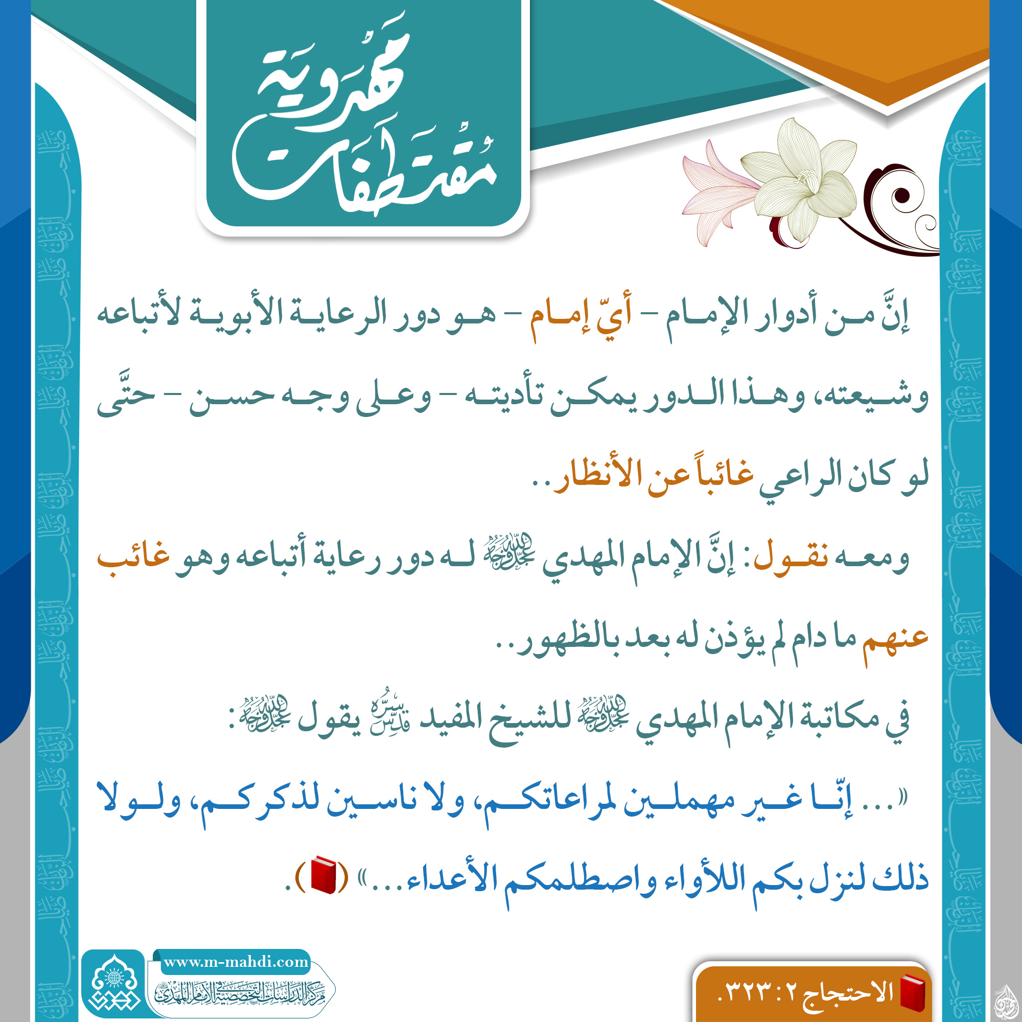 بسم الله الرحمن الرحيم اللهم كن لوليك الحجة بن الحسن صلواتك عليه وعلى آبائه في هذه الساعة وفي كل ساعة وليا وحافظا وقائدا وناصرا ودليلا وعينا حتى تسكنه ارضك طوعا وتمتعه فيها طويلا