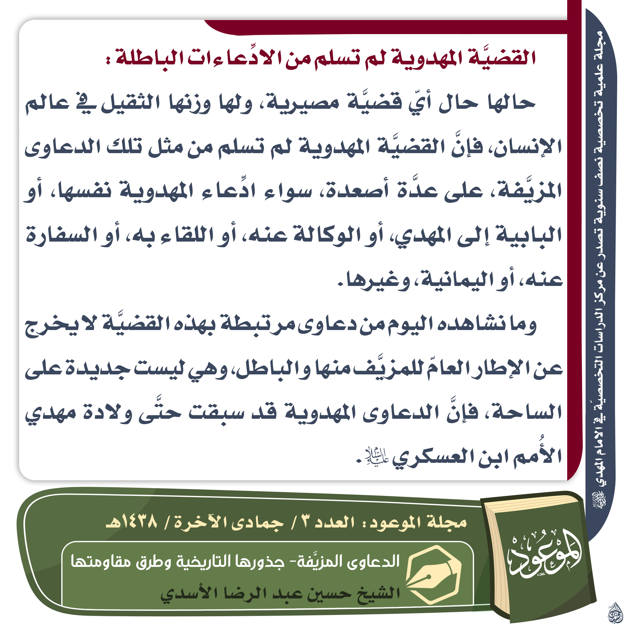 حالها حال أيّ قضيَّة مصيرية، ولها وزنها الثقيل في عالم الإنسان، فإنَّ القضيَّة المهدوية لم تسلم من مثل تلك الدعاوى المزيَّفة، على عدَّة أصعدة، سواء ادِّعاء المهدوية نفسها، أو البابية إلى المهدي، أو الوكالة عنه، أو اللقاء به، أو السفارة عنه، أو اليمانية، وغيرها.