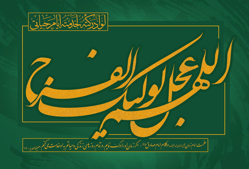 به نام خداوند بخشنده مهربان بار الها: ولی امرت امام زمان حجت بن الحسن را که درودهایت بر او وپدرانش باد در این هنگام وبرای همیشه سرپرست ونگهدار ورهبر ویاور وراهنما ونگاهبان باش تا گیتی را به فرمان او آوری وتا دیر زمان، بهره مندش گردانی | اَللّـهُمَّ کنْ لِوَلِیک الْحُجَّةِ بْنِ الْحَسَنِ صَلَواتُک عَلَیهِ وَعَلی آبائِه فی هذِهِ السَّاعَةِ وَفی کلِّ ساعَة وَلِیاً وَحافِظاً وَقائِداً وَناصِراً وَدَلیلاً وَعَیناً حَتّی تُسْکنَهُ اَرْضَک طَوْعاً وَتُمَتِّعَهُ فیها طَویلاً