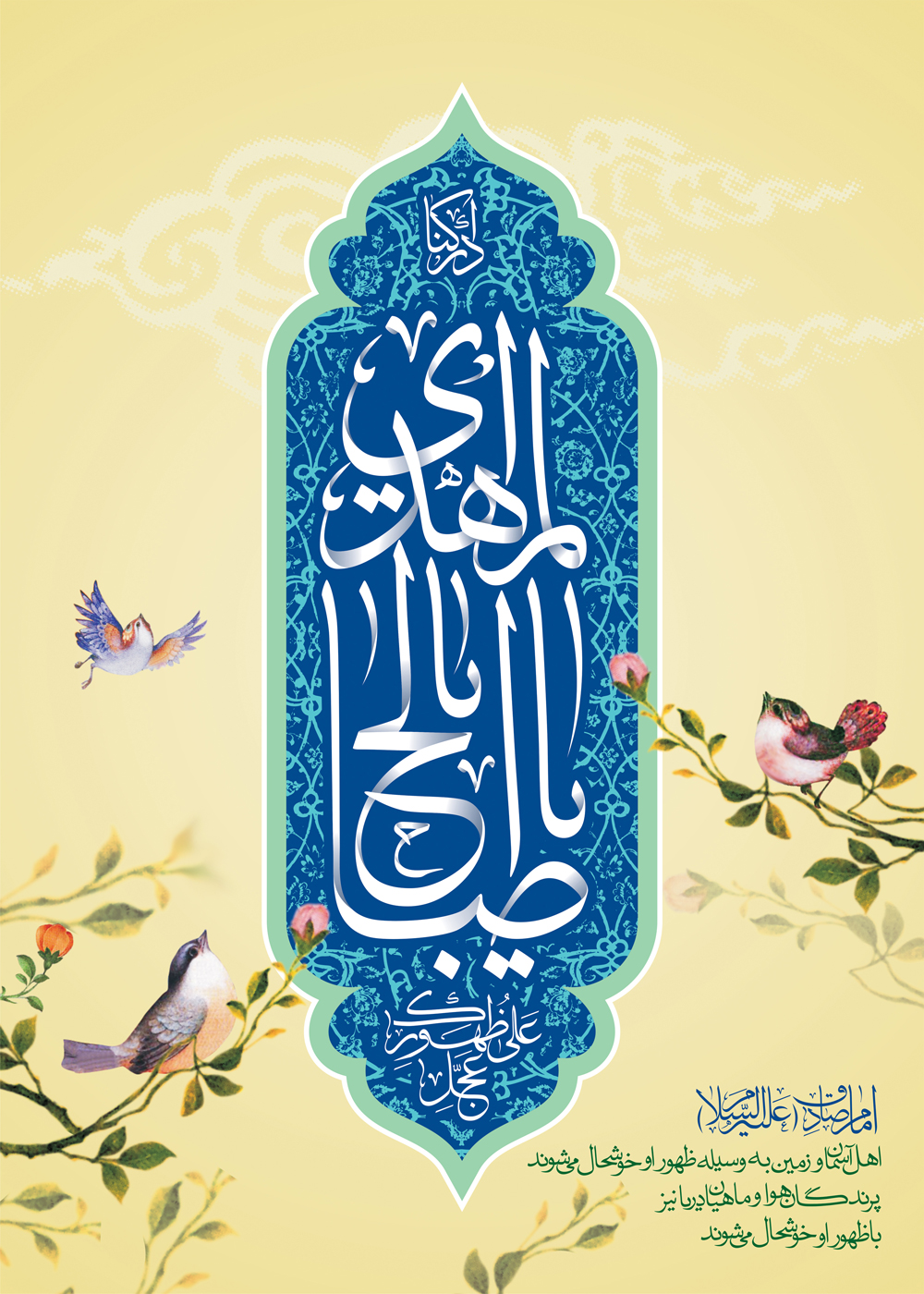 به نام خداوند بخشنده مهربان بار الها: ولی امرت امام زمان حجت بن الحسن را که درودهایت بر او وپدرانش باد در این هنگام وبرای همیشه سرپرست ونگهدار ورهبر ویاور وراهنما ونگاهبان باش تا گیتی را به فرمان او آوری وتا دیر زمان، بهره مندش گردانی | اَللّـهُمَّ کنْ لِوَلِیک الْحُجَّةِ بْنِ الْحَسَنِ صَلَواتُک عَلَیهِ وَعَلی آبائِه فی هذِهِ السَّاعَةِ وَفی کلِّ ساعَة وَلِیاً وَحافِظاً وَقائِداً وَناصِراً وَدَلیلاً وَعَیناً حَتّی تُسْکنَهُ اَرْضَک طَوْعاً وَتُمَتِّعَهُ فیها طَویلاً