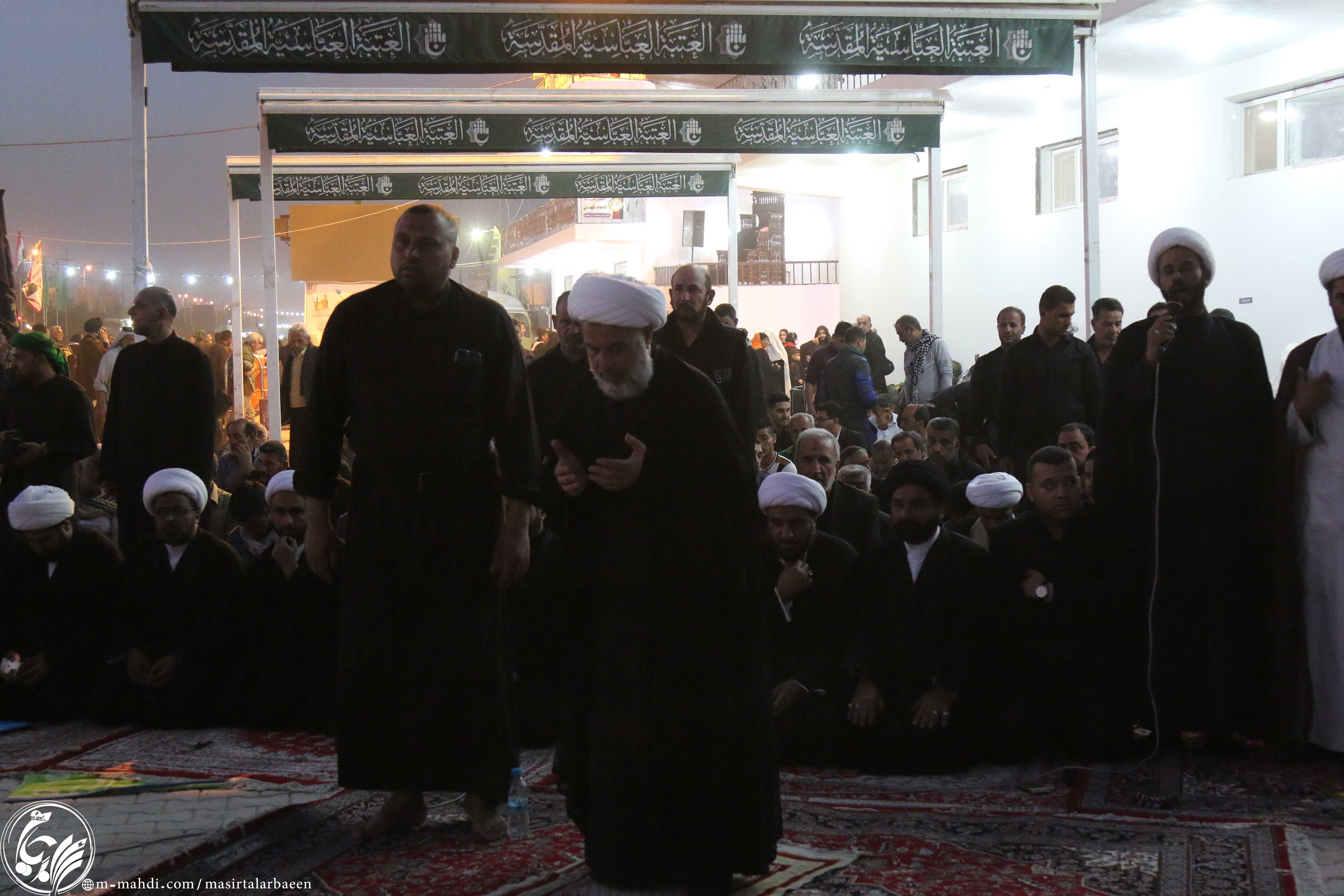 ممثل المرجعية العليا والمتولي الشرعي للحرم الحسيني يؤم المصلّين في طريق يا حسين في مقر الموقع المركزي للمشروع التبليغي للحوزة العلمية في زيارة الأربعين