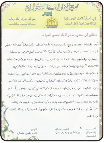 أيها الإمام المهدي (عج) يا من تعرض عليه أعمالنا يا شفيعنا عند الله اشفع لنا عند الله يا من هو قريب عنا فأنت أقرب الينا من لمح البصر يامنقذ البشرية يا مقيم دولة العدل الإلهي يا خير البرية على الورى يامن جعله الله منقذاً للبشرية يا من قوله: (أن أحب الأعمال ألي انتظار الفرج) فسلام عليك يوم ولدت ويم تظهر لتنقذ العالم من الظلم والجور الى العدل و الإنسانية أننا نرجوك ونتوسل اليك بأن تدعوا بأن تدعوا لنا عند الواحد الأحد الفرد الصمد أن يغفر ذنوبنا ويجعل أعمالنا خيراً فأن يمحو سيأتنا و يحفض العدين والمذهب ويسدد خطانا في أن نكون من جنودة والسائرين على نصيحة من المحامين عنه والمدافعين عنه ونتوسل به الى الله في قيام دولة كريمة تعز بها الاسلام واهله وتذل به النفاق وأهله.