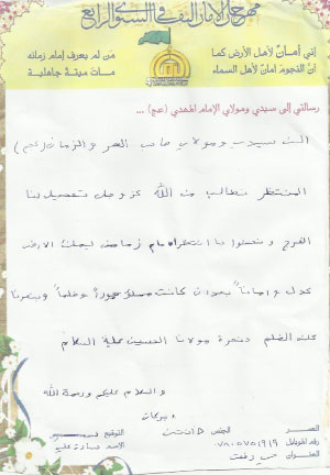 الى سيدي ومولاي صاحب العصر والزمان عليه السلام المنتظر، نطلب من الله عز وجل تعجيل الفرج لنا، ونحن بانتظار إمام الزمان.