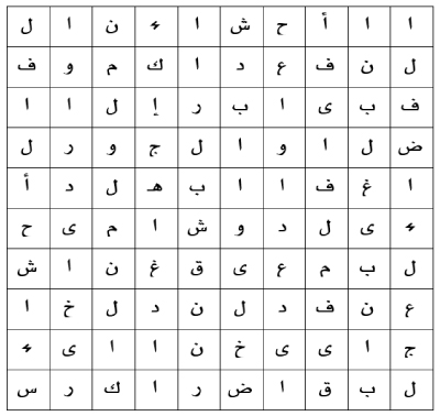 اشطب على كلمات بيتي الشعر داخل المربع واستخرج كلمة السرّ المكوَّنة من (١٢) حرفاً، وهي عبارة عن اسم المكان الذي تكون منه انطلاقة السفياني، الواقع في حدود الأردن وسورية.