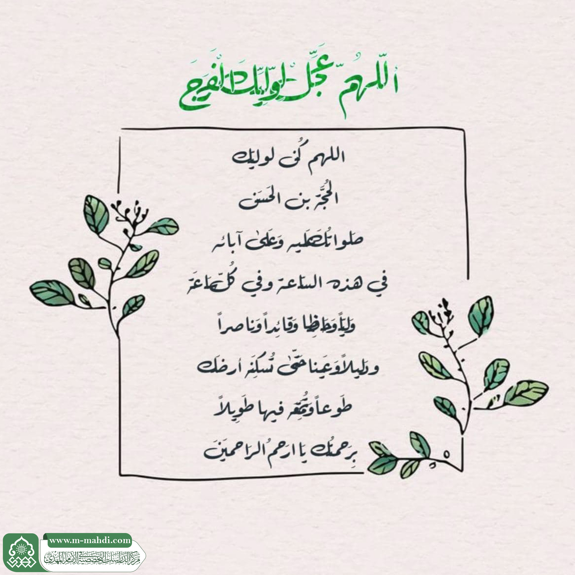 بسم الله الرحمن الرحيم اللهم كن لوليك الحجة بن الحسن صلواتك عليه وعلى آبائه في هذه الساعة وفي كل ساعة وليا وحافظا وقائدا وناصرا ودليلا وعينا حتى تسكنه ارضك طوعا وتمتعه فيها طويلا